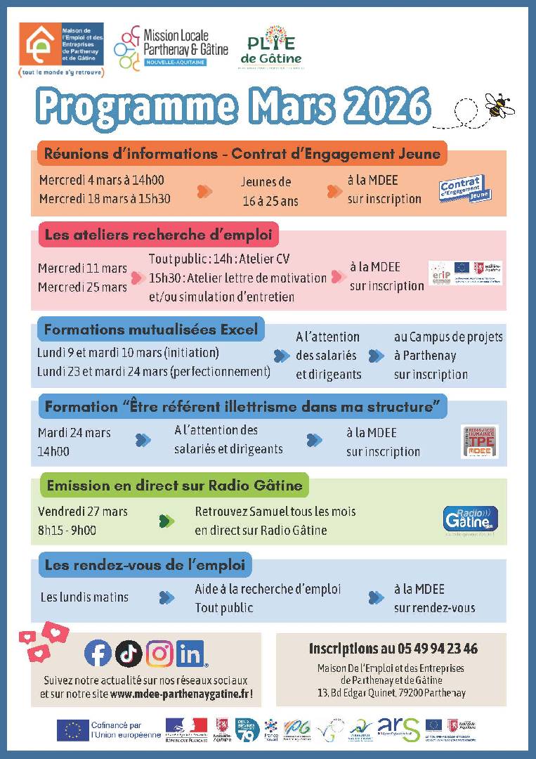BIENTÔT Mission Locale Parthenay et Gâtine, programme MARS 26 - Parthenay le lundi 30 mars 2026 PROGRAMME de MARS 2026 Mission Locale Parthenay et Gâtine |