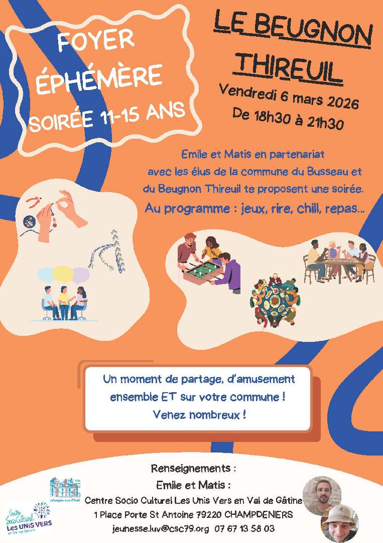 BIENTÔT Spécial Foyer Ephémère Le Busseau + Beugnon Thireuil - Le Busseau le vendredi 06 mars 2026 La commune de Le Busseau et la commune de Beugnon-Thireuil, en partenariat avec le centre socio-culturel du Val d'Egray, organisent, le vendredi 6 mars 2026 de 19h à 21h30, une soirée « foyer éphémère », à destination des jeunes des deux communes ayant entre 11 et 15 ans. |