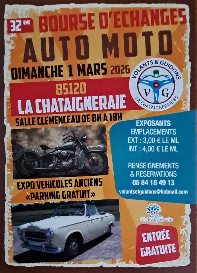 Bourse d'échange auto-moto et Expo véhicules anciens - La Chataîgneraie le dimanche 01 mars 2026 Bourse d'échange auto-moto et expo de véhicules anciens. |