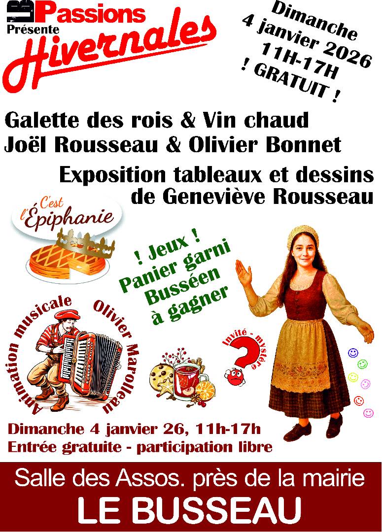 LBPassions Spécial Epiphanie - Le Busseau le dimanche 04 janvier 2026 Au Busseau le 4 janvier 26 de 11h à 17h, Joël Jojo Rousseau - qui fut le boulanger du Busseau pendant 30 ans et Olivier Gaston Bonnet, qui fut longtemps son apprenti vous proposent de déguster (gratuitement) sa fameuse galette au sucre, arrosée d'un vin chaud de leur cru. | |