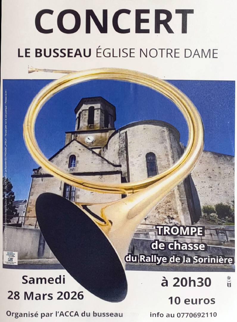 Concert de trompe de chasse - Le Busseau le samedi 28 mars 2026 Concert de trompe de chasse, au Busseau (à l'église). |