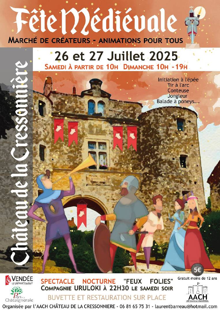 Fête et marché médiéval - La Cressonnière le dimanche 27 juillet 2025 Pour la deuxième fois au Château de la Cressonnière se déroulera une grande fête médiévale. Reconstitution historique, marché médiéval, concert, troubadour, conteuse, jongleur, poneys etc.... |
