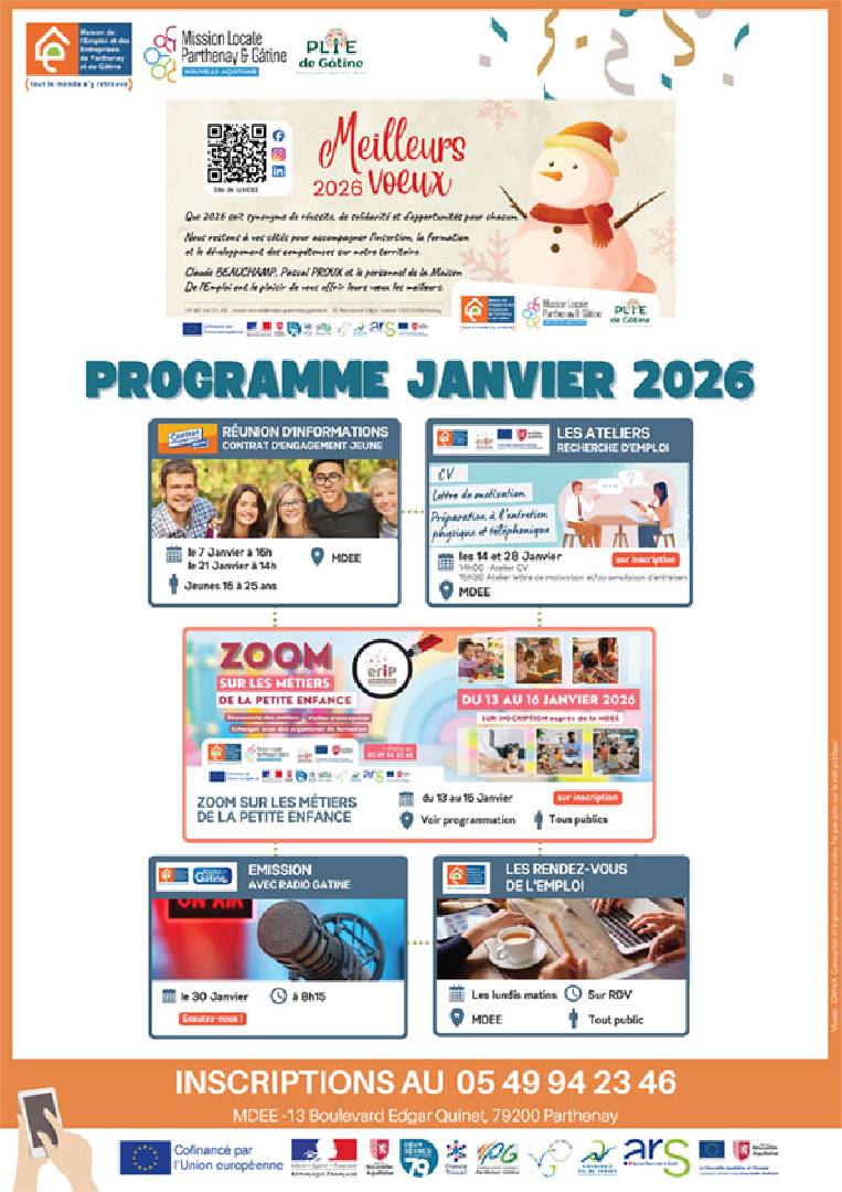 BIENTÔT Mission Locale Parthenay et Gâtine, programme janvier 26 - Parthenay le vendredi 30 janvier 2026 Tout le programme de janvier 2026 de la Mission Locale Parthenay et Gâtine sur l'affiche jointe |