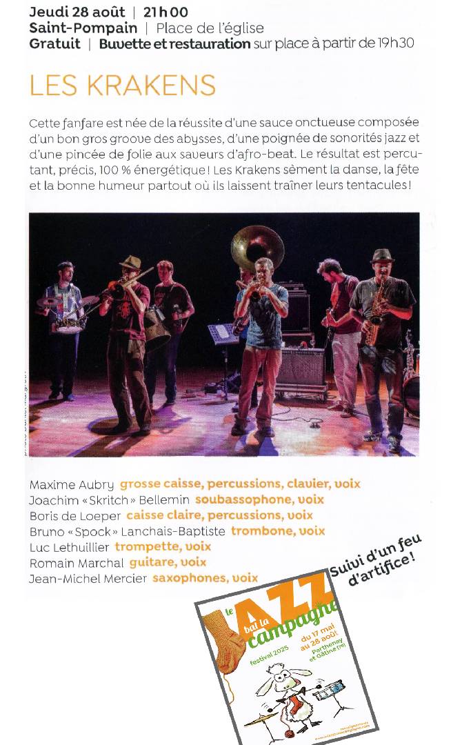 Les Krakens - Saint-Pompain le jeudi 28 août 2025 Dans la cadre de Le jazz bat la campagne |