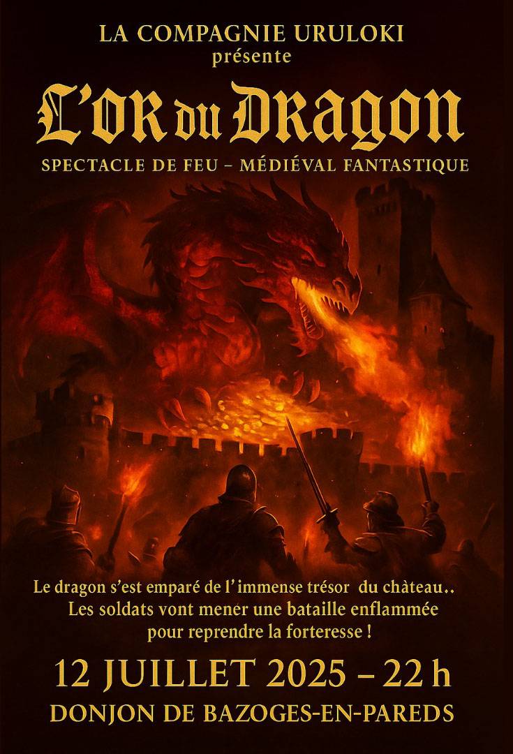 Spectacle de feu - Bazoges-en-Pareds le samedi 12 juillet 2025 Laissez-vous envoûter par L'Or du Dragon, un spectacle féérique mêlant flammes, poésie et mystères. À travers 11 tableaux saisissants, la compagnie Uruloki vous promet une soirée de surprises et d'émotions enflammées ! |
