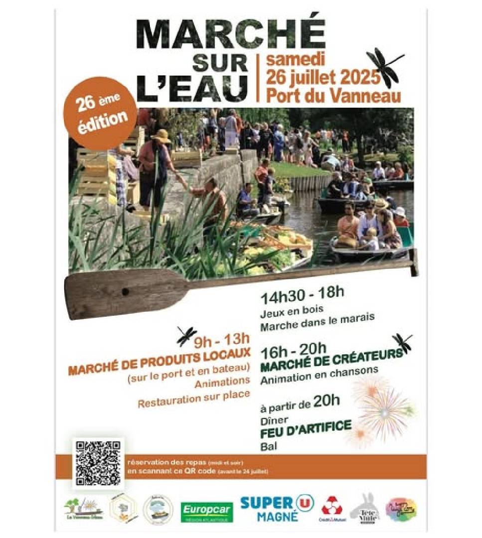 Marché sur l'eau - Le Vanneau le samedi 26 juillet 2025 Port du Vanneau : marché sur l'eau, marche dans le marais, marché de créateur, bal... voir les détails sur l'affiche |